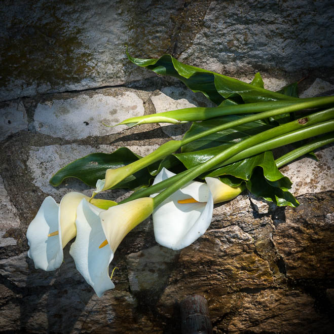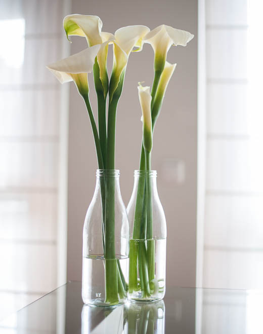 Unos metros más allá, corté unas calas a pie de carretera, las humedecí en la fuente, y así lucen en mi casa.